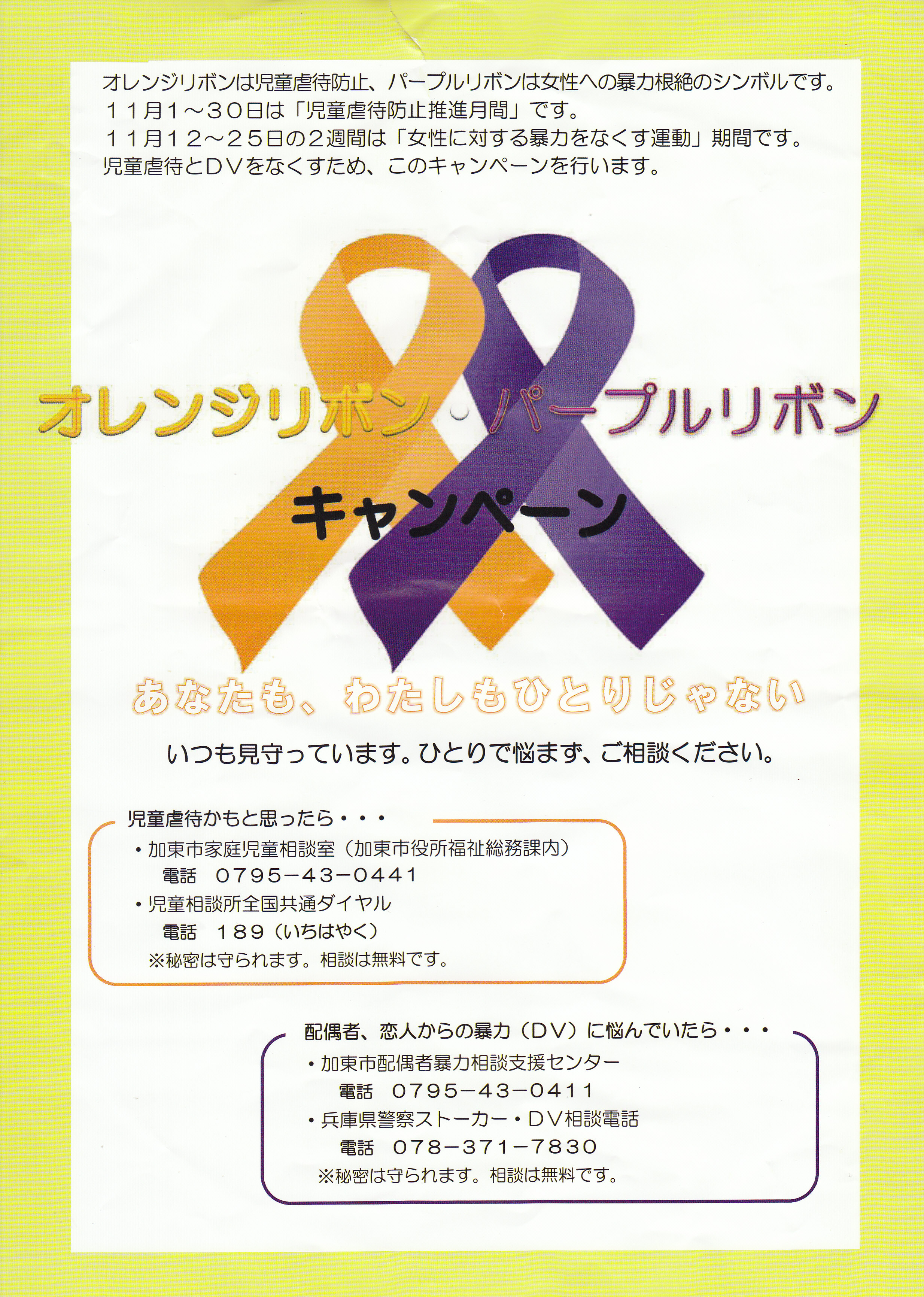 オレンジリボン・パープルリボンはご存知ですか? 2018年11月26日 最終更新日時 : 2025年12月24日 曽野医院 11/26(月)加東市の児童虐待防止推進月間研修会に参加させて頂きました。 児童虐待とは ①身体的虐待 ②性的虐待 ③ネクレクト ④心理的虐待 があります。 平成29年度中に、日本全国210ヵ所の児童相談所が 児童虐待相談として対応した件数は 133.778件で、過去最高です。 FacebookXHatenaCopy
